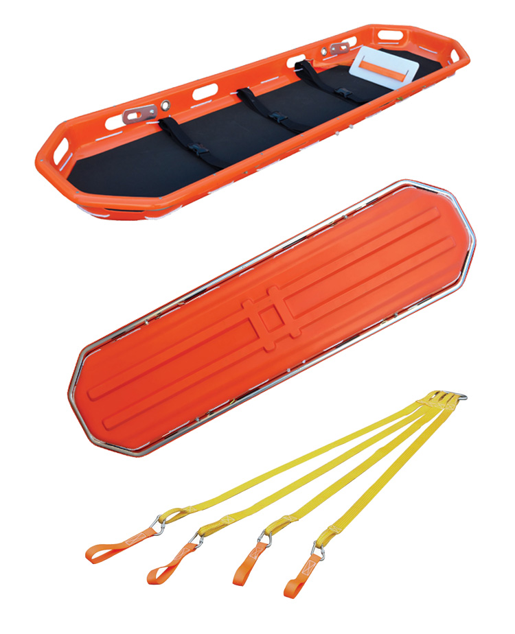 此擔架的構造著眼于急救的廣泛性,靈活性和特殊性,如空中或海上救援。框架堅固耐用,簡便可靠的裝置讓操作人員能夠安全快捷的采取急救措施。鉤懸能與飛機上掛鉤連接,實現野外救援。擔架配有可調節的腳部安全機械裝置,安全帶等。材質采用無毒無污染釋放的材料,具有防火耐磨損和防侵蝕的功能。